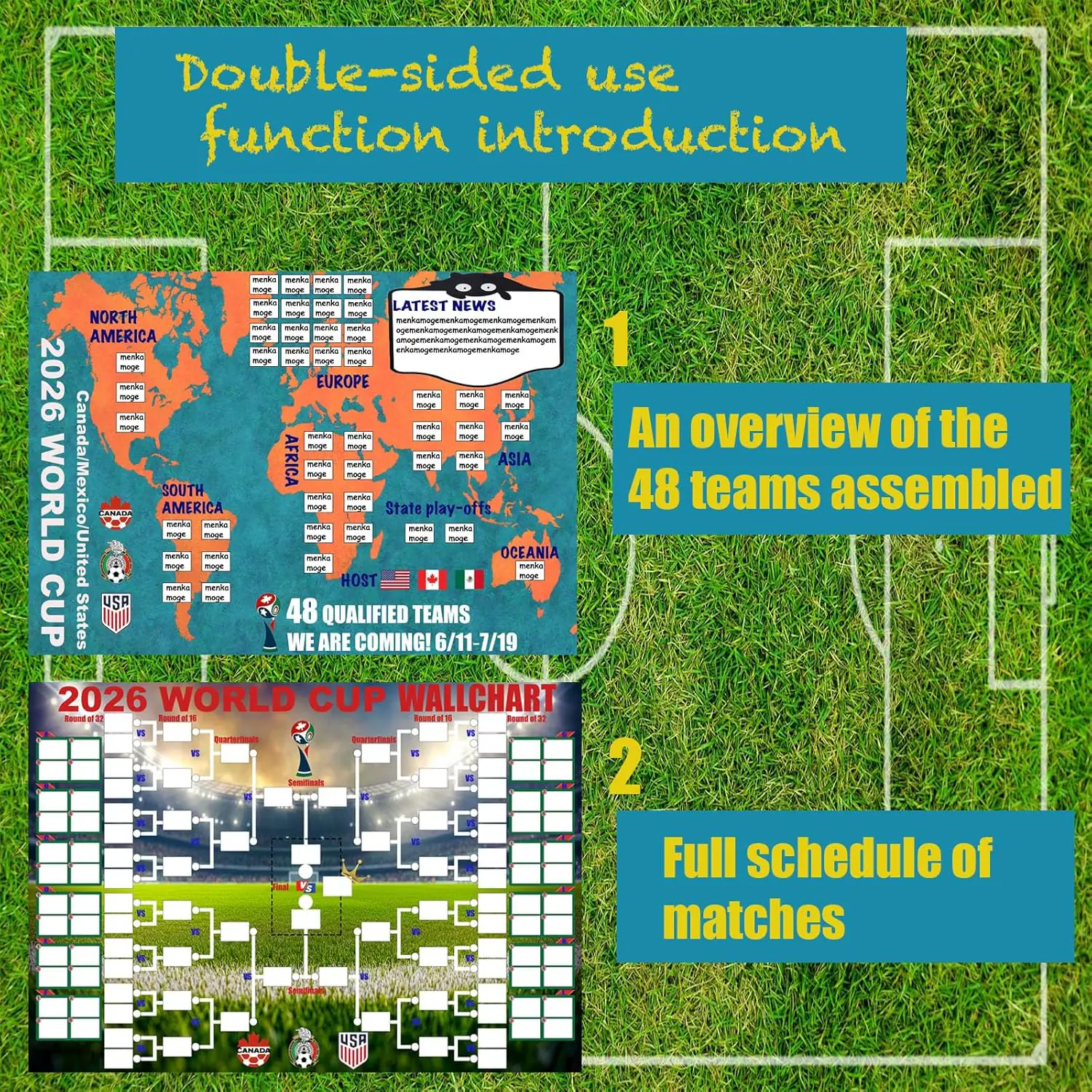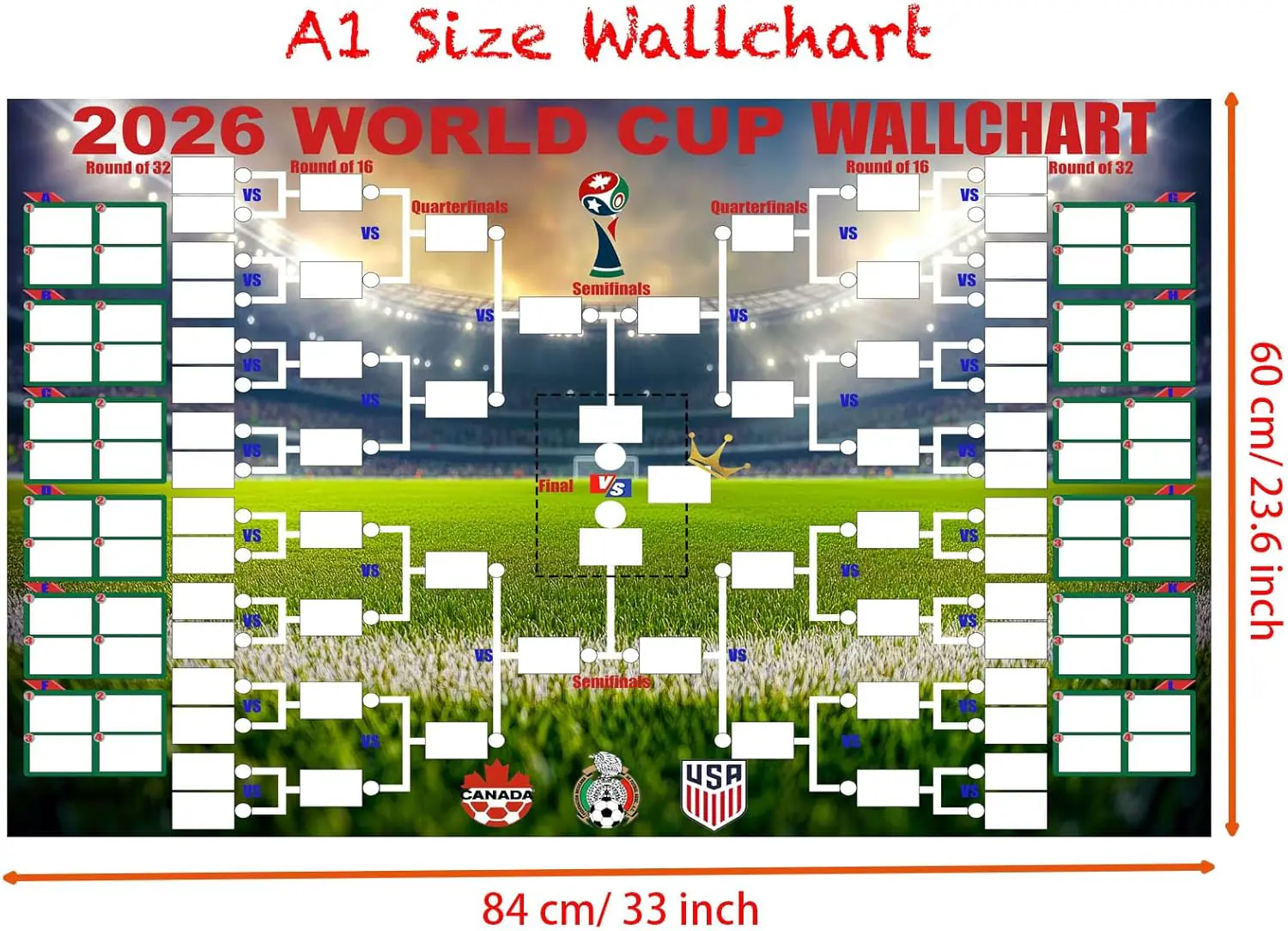 The Official Wall Chart of the 2026 World Cup: Celebrate the global soccer event (June 11-July 19, USA) with this A1-sized fixture poster. Keep track of the winning teams and knockout round matches in all phases and hang it in your home, office or bar to support your favorite team.
