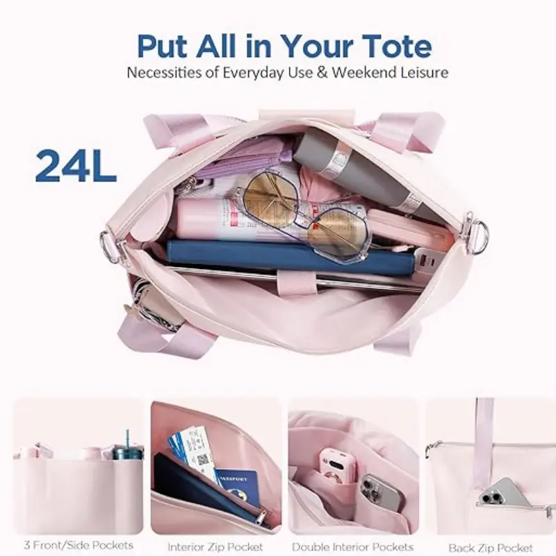 Customization Options: Logo printing, color choices (10+ shades), and material upgrades (e.g., vegan leather trim) for 24L Women Nylon Tote Bag Wholesale.