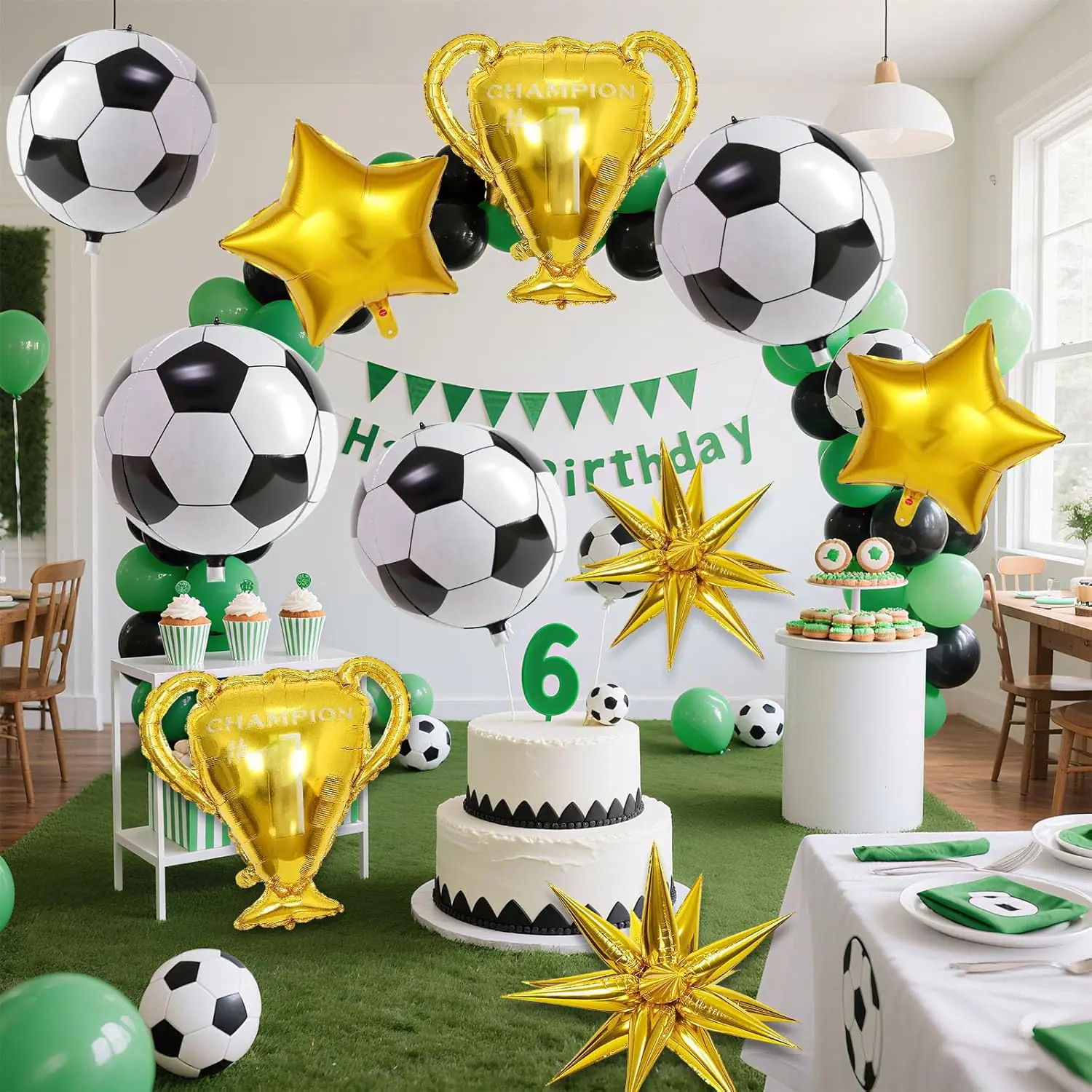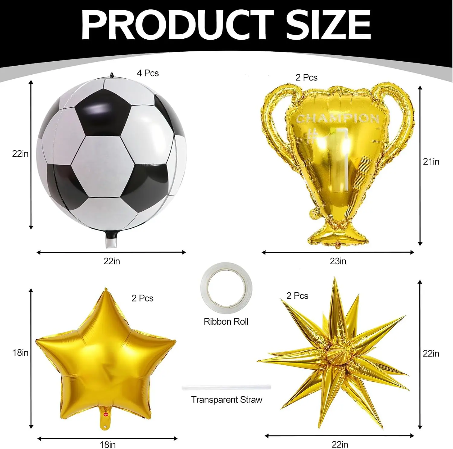• Complete 10PCS Soccer Party Decorations Set Includes 4x 22″” 4D Sphere Soccer Balloons, 2x Golden Championship Trophy Balloons, 2x Star Burst Balloons & 2x Shimmering Star Balloons. Perfect for creating vibrant soccer balloon arch kits, trophy displays, or wall decor – everything needed for epic soccer themed party decorations in one box