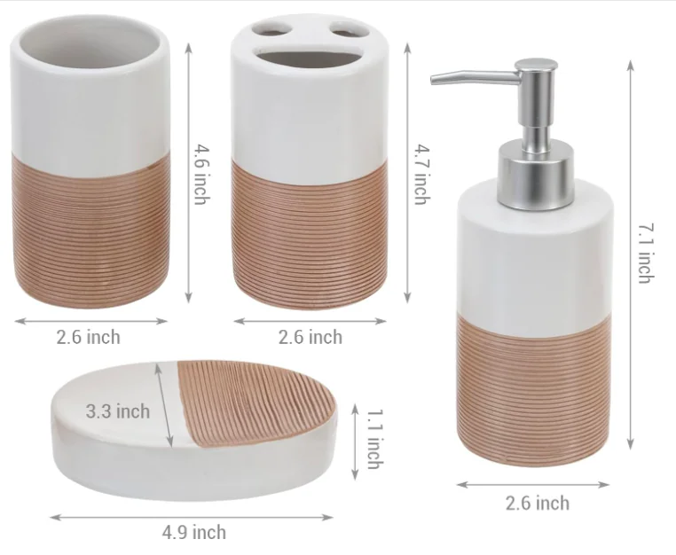 Approximate Dimensions: Soap Dish – 4.9 L x 3.3 W x 1.1 H; Toothbrush Holder – 4.7 H x 2.6 Diameter; Tumbler – 4.6 H x 2.6 Diameter; Liquid Soap Dispenser – 7.1 H x 2.6 Diameter (in inches)