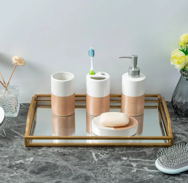 Aesthetic 4-piece bathroom counter accessory set made of dual-toned ceramic featuring white with a clay color accent and striped texture