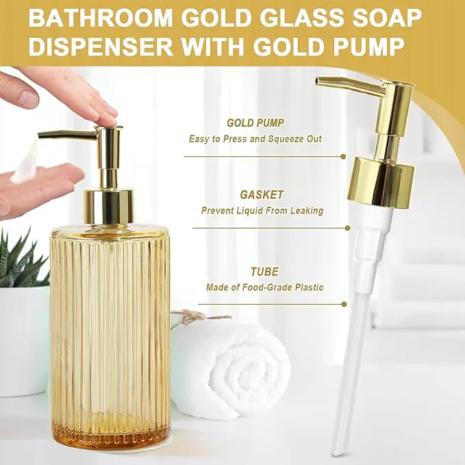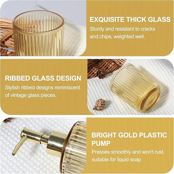 Premium Sturdy Heavy Cut Glass: The gold bathroom set is made of thick and durable glass, which adopts a retro ribbed design, and the glass uses diamond cutting technology. Yellow glass bathroom accessories are exquisite and translucent with bright colors, creating a retro and warm atmosphere in the bathroom. The plastic pump prevents leakage and rusting over time and also ensures that the soap dispenser is easy and comfortable to use.