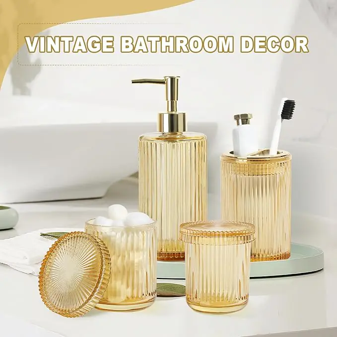 Cute Bathroom Accessories Perfect Present: The exquisite ribbed glass bathroom set is an ideal decoration for every style: country, western decor, modern, vintage, luxury style. The luxury bathroom accessories are also a present for family, friends and co-workers; Great as a housewarming present, wedding present, or for renovators looking to upgrade the bathroom in their home or apartment; Bathroom essentials for new apartment; Guest bathroom decor.