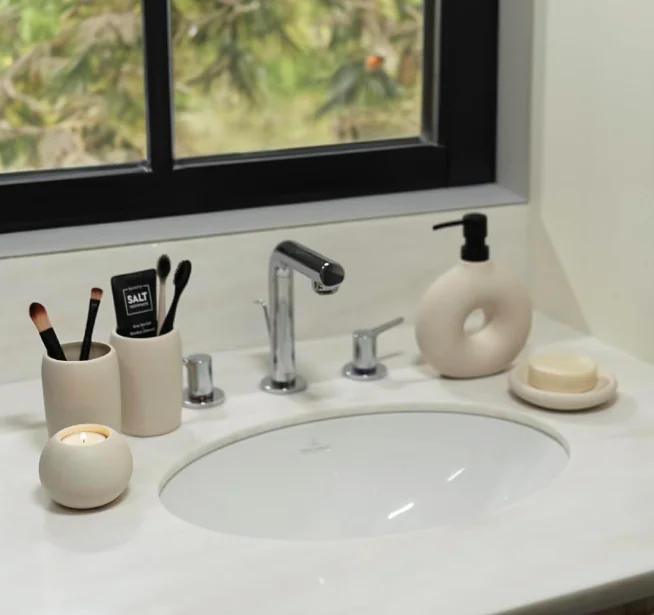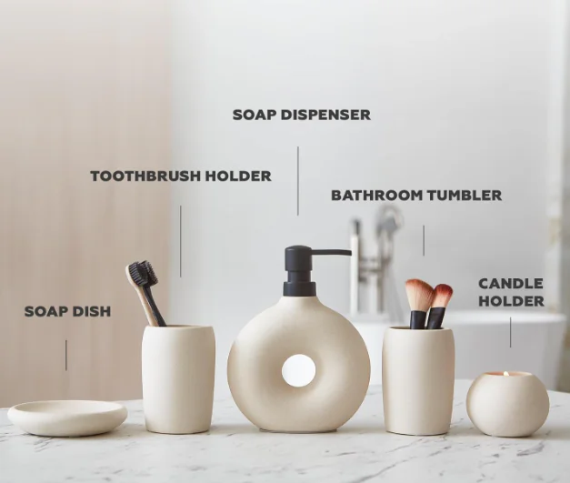 Matte Glazed Ceramic: The 5pcs ceramic bathroom accessory set has a unique matte finish that not only adds to its modern home decor appeal but also effectively repels dust.