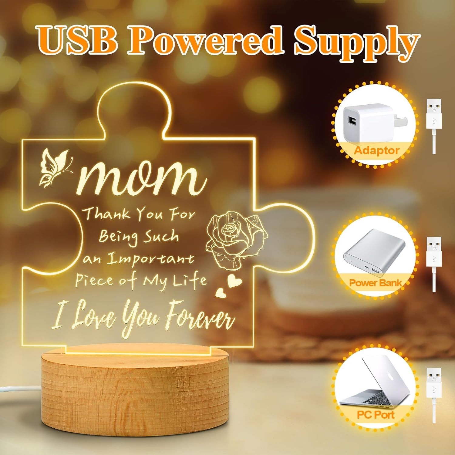 • 💕【Mom Gifts Apply for Occasions】: A perfect mother gift with this unique acrylic night light lamp. Create a surprise for moms on mothers Day gifts, birthday gifts, Thanksgiving gifts, Christmas gifts, Anniversary gifts, Valentine’s Day gifts, etc. These lovely mom night light gifts will make mom smile and feel warm in her heart. Just push the switch button, and the engraved night light will keep company with her all night, just like you’re always by her side.