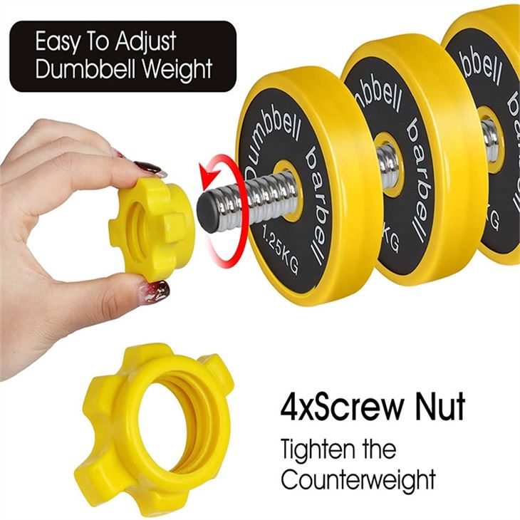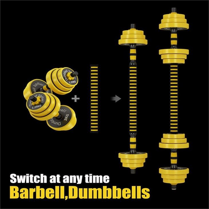 FASHION COLOR COATED EYE-CATCHING DESIGNAdjustable 2 in 1 Dumbbell Barbell is made of embossed weight plates with obvious weight markings, coated with a black paint finish to prevent rust and corrosion. And particularly, yellow TPU protective cover on the dumbbell to provide essential grip and security during workouts, and that will protect floors and equipment from being scratched, scuffed, and dented.