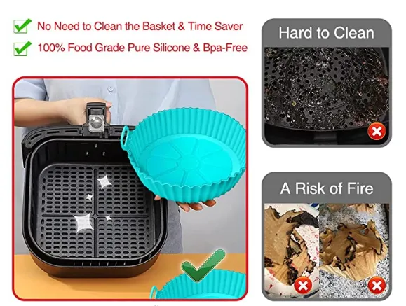 • BETTER THAN DISPOSABLE PAPER LINERS: Still using disposable parchment liner paper? Refrains from any unnecessary fire hazards on highly flammable parchment papers! Silicone air fryer basket bowl, it takes place of the parchment liners and will be cheaper in the long run. It is a lot easier to place and remove than a paper filter and cooks just as well. Silicone air fryer liners