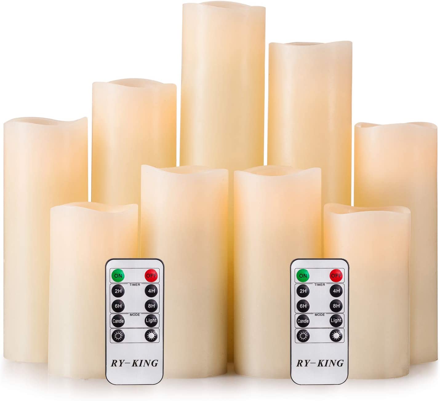 PACKAGE INCLUDE: Two 5.1″, two 5.5″, two 6.3″, a 7.1″, a 7.9″ and a 8.7″ height battery operated real wax pillar candles (each 2.1″ diameter), two 10-key remote controls, a user manual. This Battery Operated Flameless Candle can be widely applied to Birthday, Christmas, Home decorations, Bars, Hotel, Parties, Holidays, Wedding, or other occasions. It’s so classic and romantic.