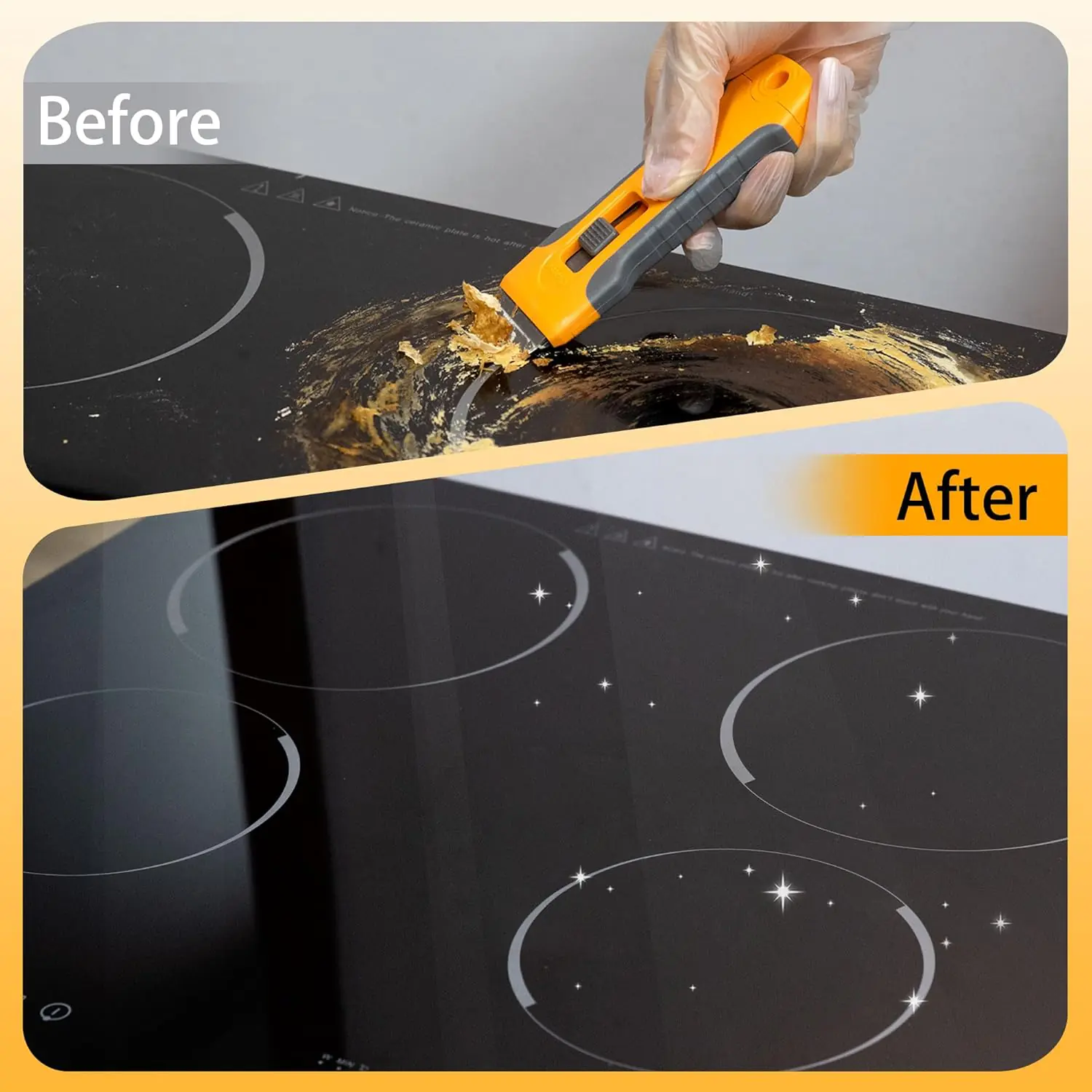 Perfect for scraping off burnt residues on your ceramic stove top, our Razor Blade Scraper Tool ensures your stove retains its shine and efficiency. Not limited to stove tops, the scraper is versatile enough to remove paint residues on adhesive leftovers on your glass table and windows.
