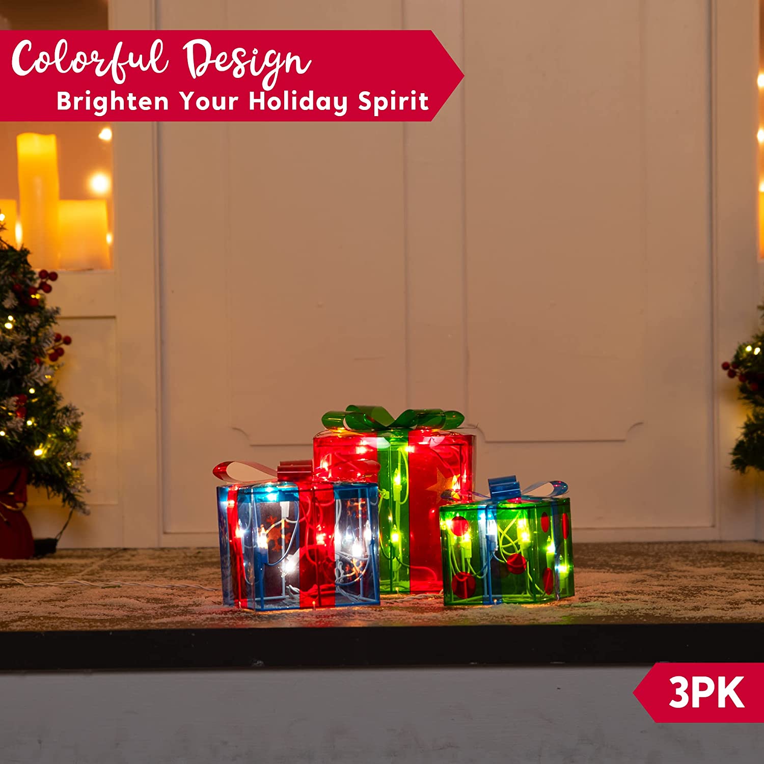 SUPER VALUE PACK:Our Christmas Boxes Yard Light Decorations includes 3 Star Patterns Gift Boxes with 50 Incandescent Clear Lights in White Wire. They are 4.3 Inch, 5.5 Inch, 7 Inch Tall. Made of Metal Frame and Red, Green, Blue PVC.Great choice for Christmas decorations.
