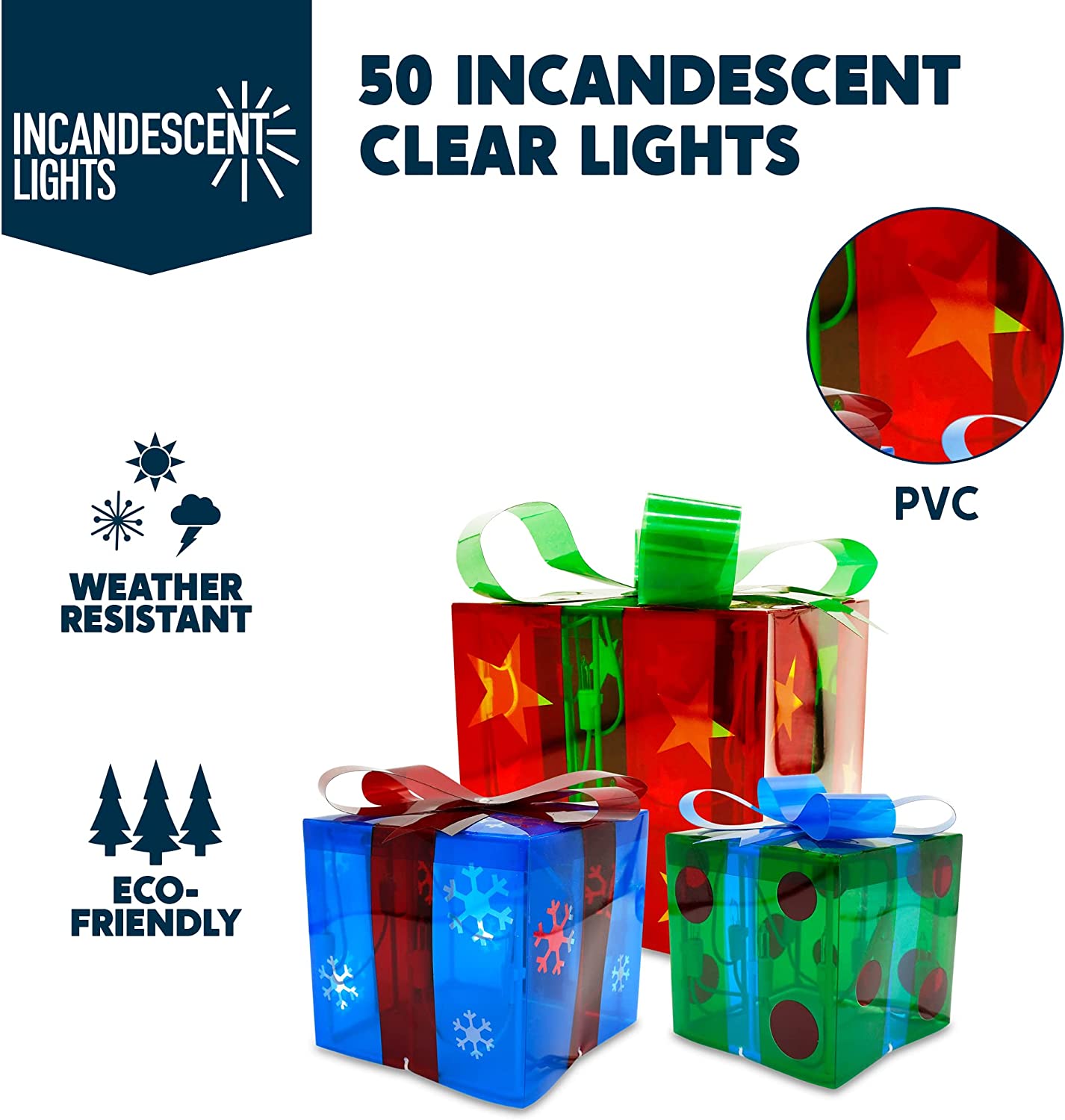 SUPER VALUE PACK:Our Christmas Boxes Yard Light Decorations includes 3 Star Patterns Gift Boxes with 50 Incandescent Clear Lights in White Wire. They are 4.3 Inch, 5.5 Inch, 7 Inch Tall. Made of Metal Frame and Red, Green, Blue PVC.Great choice for Christmas decorations.