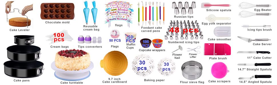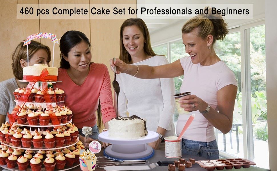 [460 PCS COMPLETE CAKE SET] –Including everything you need to start making cakes like a PRO! Turntable, 3 PCS Leakproof Cake Pans.cake levler,chocolate mold,flour siev flag,Egg Beaters,Muffin Cup Molds, Paper CupCakes,Carved Pens, Numbered Icing tips, Disposable Bags, flags,Russian tips,Scrapper Sets,Silicone Bags,Russian Tricoupers, Ciong Coupers,Cream Scraper,Straigh&Angled Spatula,Cake Server,Cake knife,Cake Smoother,Cake Board,baking papers.Flower Nail&Lifter,Cleaning Brush,Pattern Chart