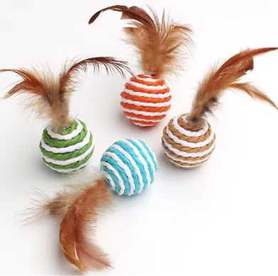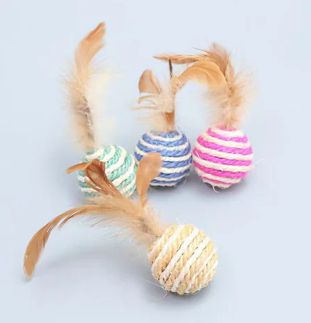 Cat toy sisal balls with feathers are multifunctional cat toys that combine durability, entertainment, and practicality. These toys typically feature a sturdy sisal ball, which is perfect for cat scratching and chewing, attached to colorful feathers that mimic the movement of birds. The combination of textures and sounds makes these cat toys irresistible to cats of all ages and breeds.