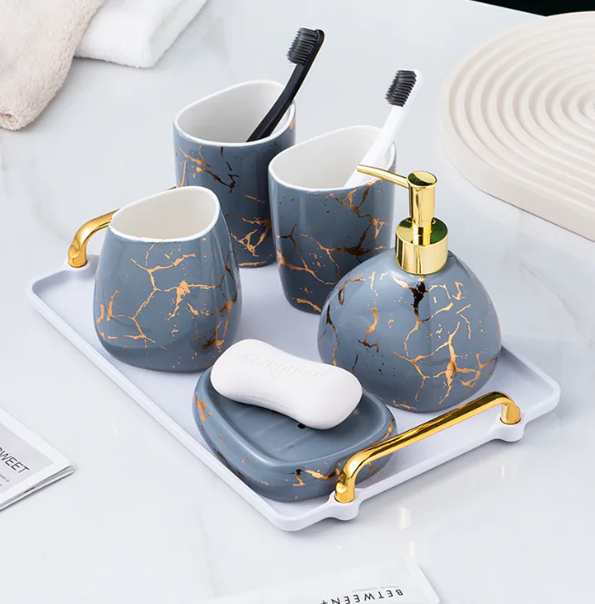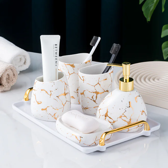 6PCS Gold Marble Look Ceramic Bath Accessory Set