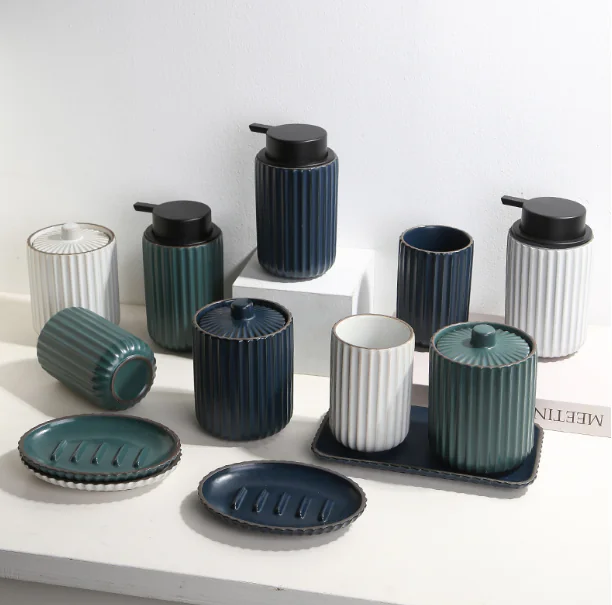 5-Piece Bathroom Accessories Set: The ceramic bathroom accessory set includes 1 foam soap dispenser, 1 liquid soap dispenser, 1 beaker, 1 cotton swab holder, and 1 soap dish. Made of elegant ceramic, our bathroom accessories set provides you with everything you need to organize your toiletries and bath products, keeping your bathroom vanity tidy. It is durable and the unique design makes your bathroom stand out