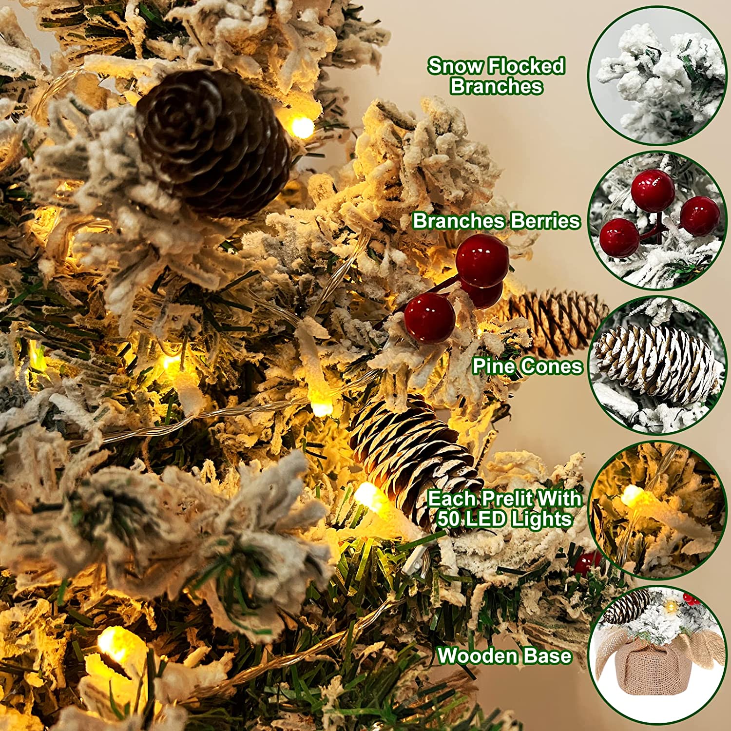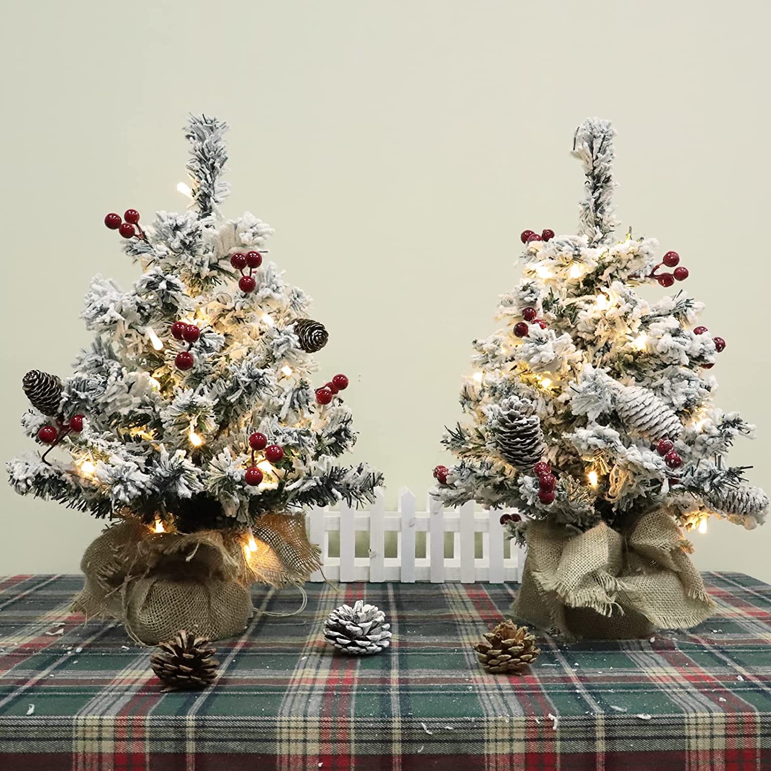 2 Pack Thick Snow Flocked Tabletop Xmas Tree:2 Pack 20 Inch Very Thick Prelit Christmas Tabletop Tree Decorations. Each Xmas tree comes with 50 snowy pine branches, 5 snowy pine cones, 30 red berries(10 stems/3pcs each stem). An 4 inch wooden base included for the tree standing upright.