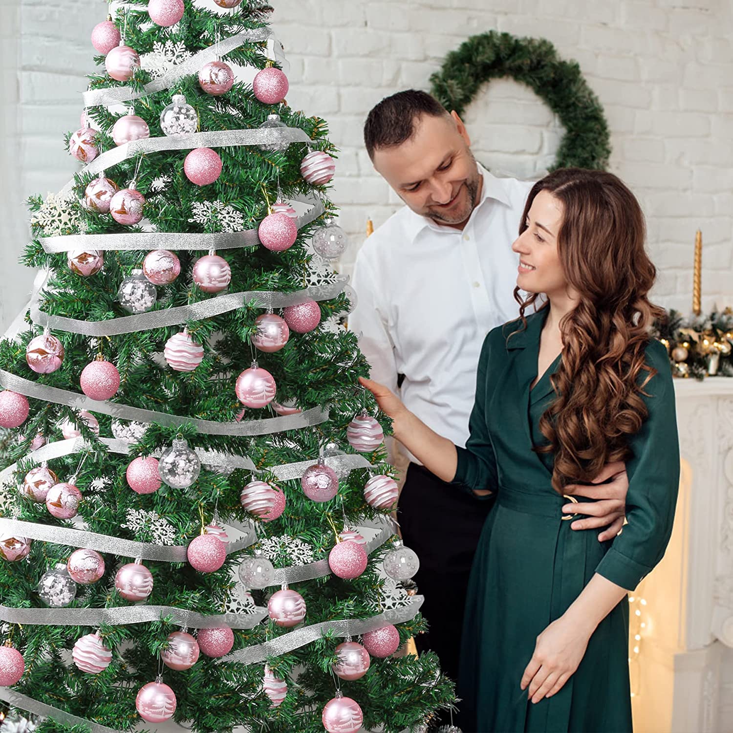 Size and design: Each package contains 34 Christmas tree ornaments (60 mm/2.36 inches). There are 7 different textures, shiny, shiny, matte, metallic, elegant and bright. The size is appropriate, and the pink color matches to decorate your modern Christmas tree.