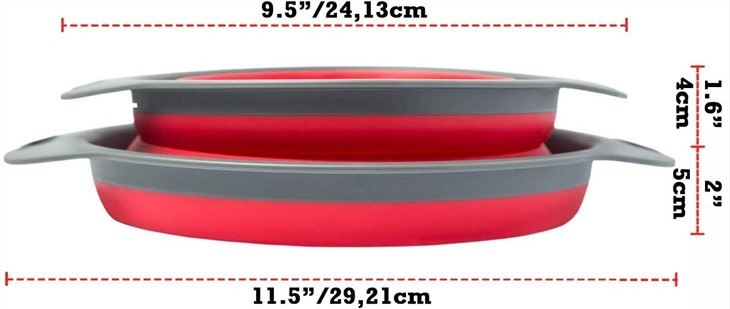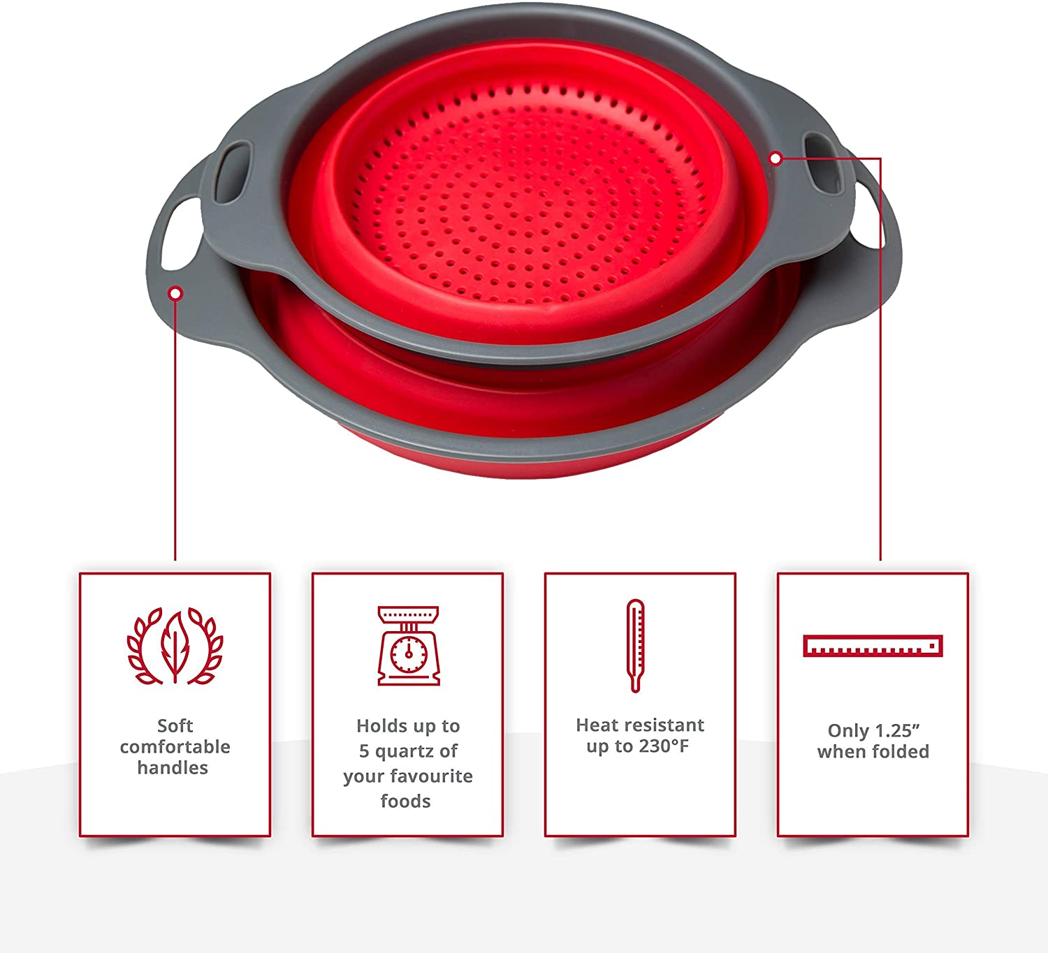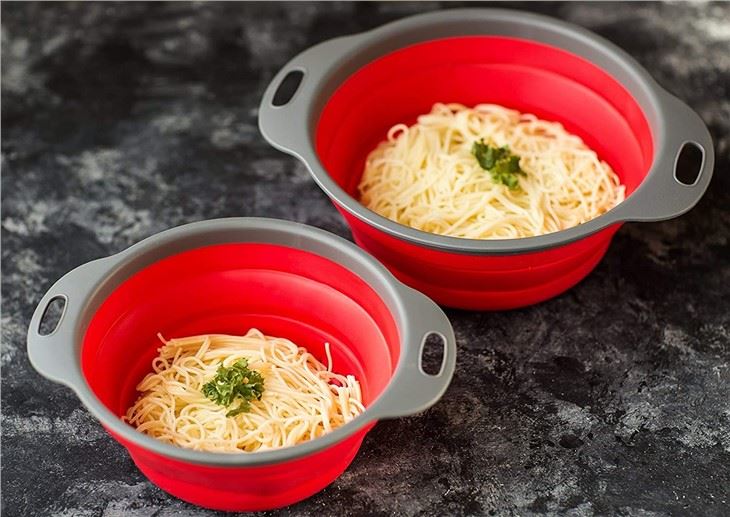 Collapsible colander used for draining most foods like spaghetti, pasta, potatoes, broccoli, green beans, carrots, spinach and other veggies, to rinse your salad leafs, fruits and fresh vegetables.