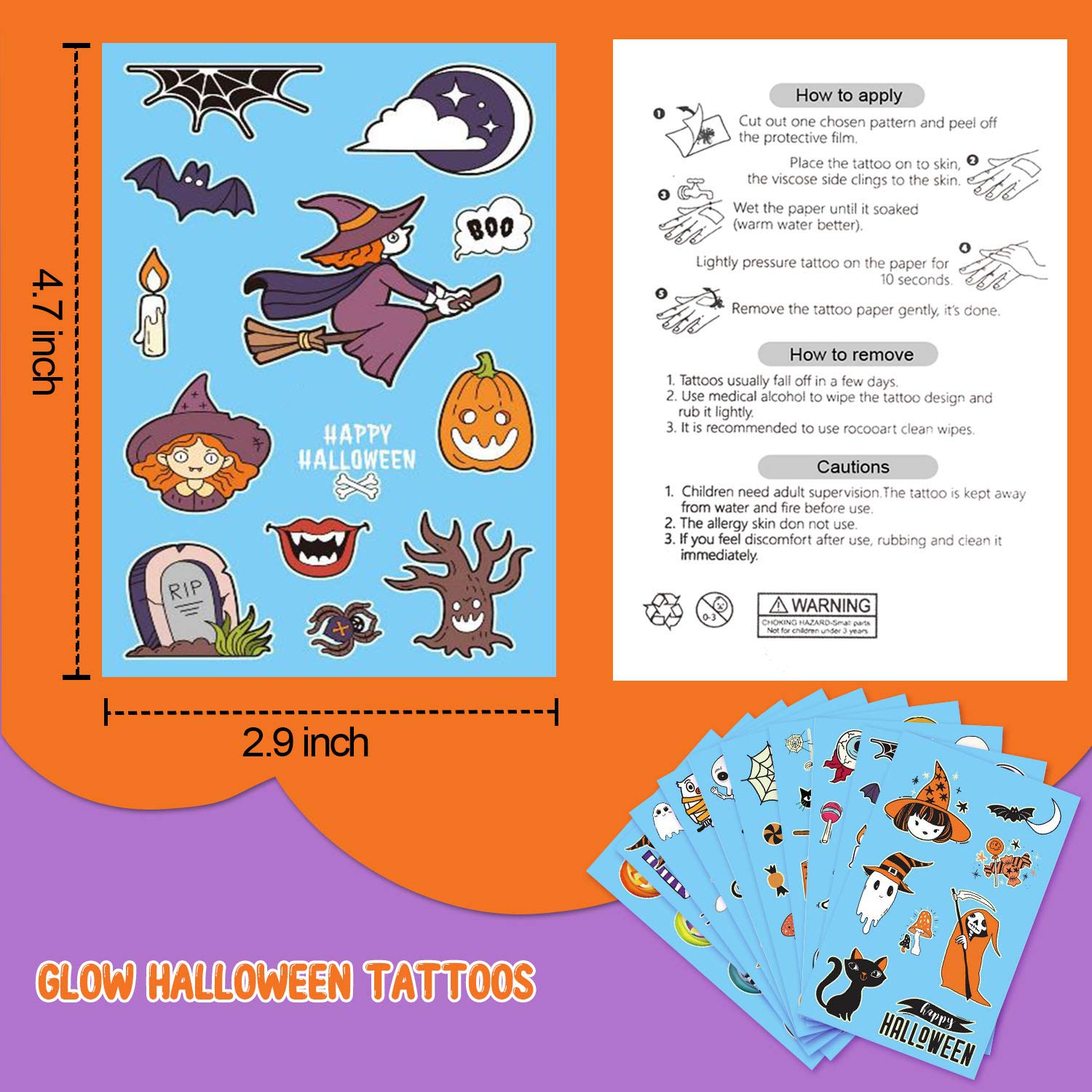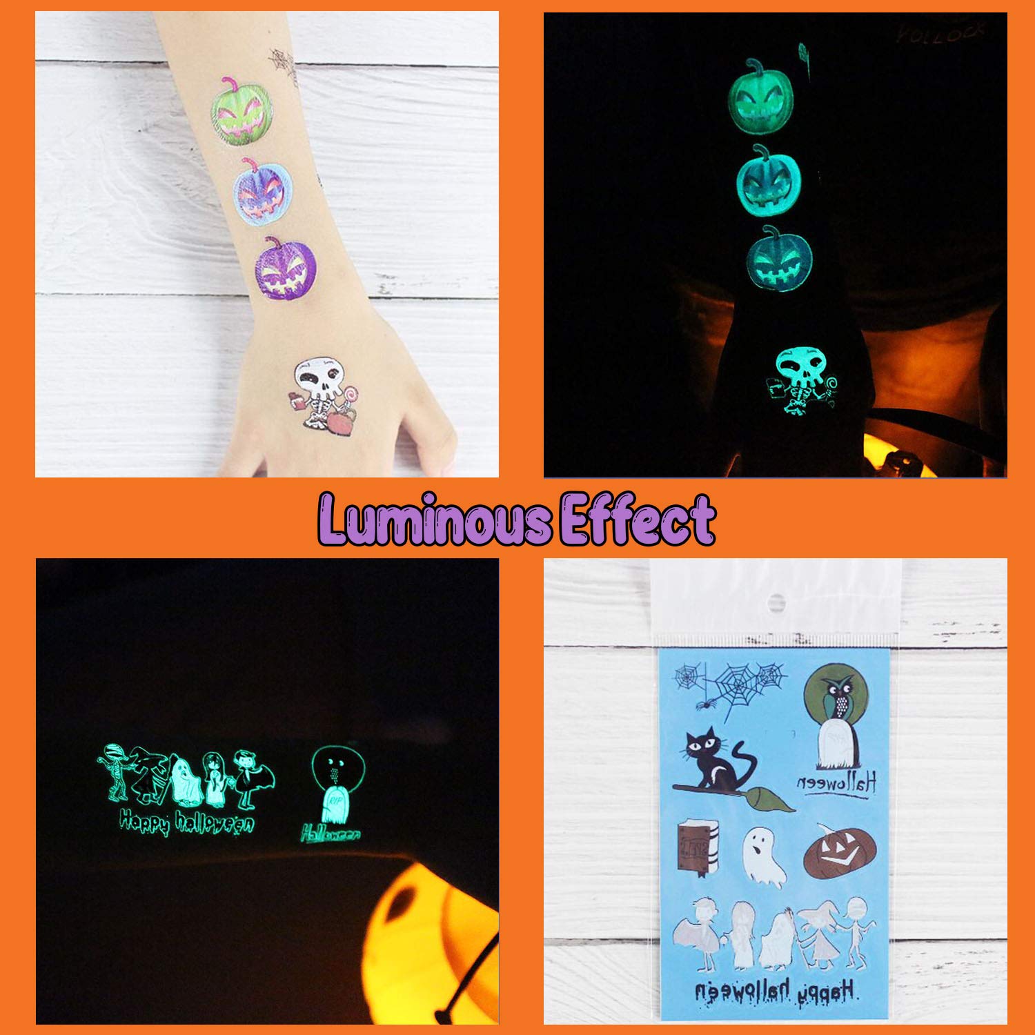 【Standard Quality】The glow Halloween theme temporary tattoos are made of high quality material and no chemical odor. Safe and environmentally friendly materials that do not cause allergies. Very suitable for kids and adults to play and share with friends.