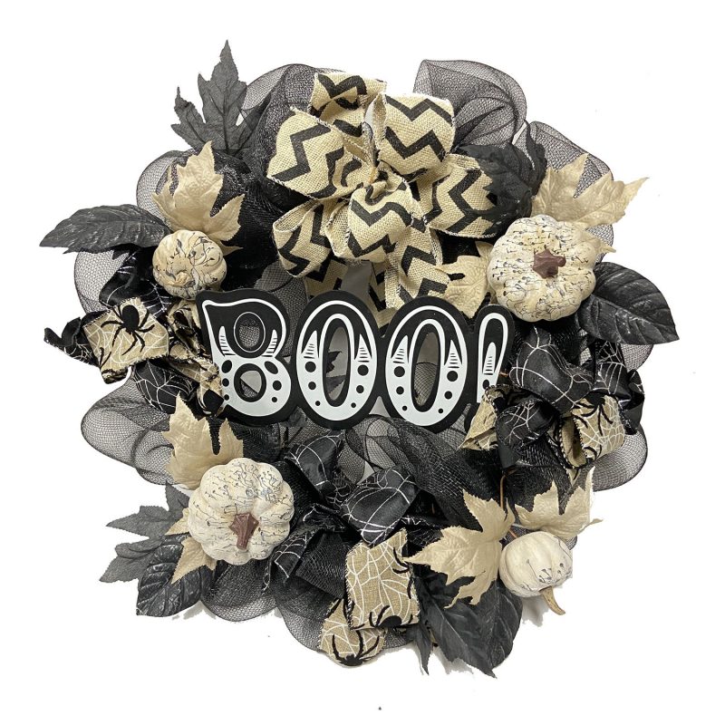 Halloween Front Door Wreaths are made of natural jute and black and white mesh cloth, decorated with different ribbons, plush ghosts, and Boo logos.