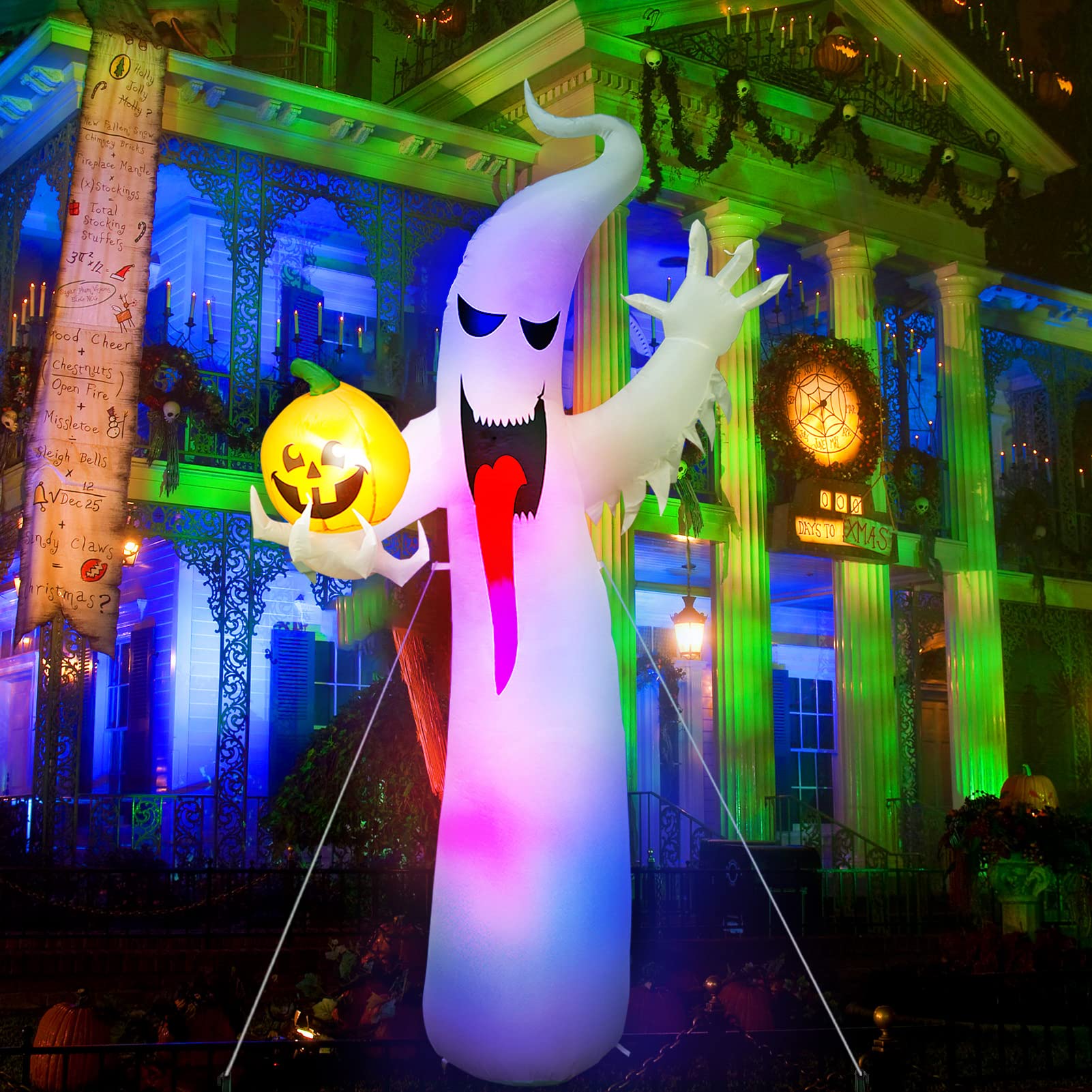 It is equipped with a powerful waterproof built- in fan, just plug into an outlet, and a few seconds later, you’ll have a glowing inflatable ghost holding up pumpkin.
