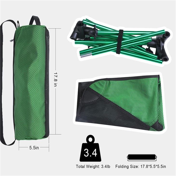 Simply remove the chair and unfold the frame, insert the rods into the corresponding slots and corner pockets on the fabric. Within a minute, it is done. Also very portable, it weighs only 3.5 pounds and can be picked up with your fingers and can be folded into an 18 x 5 inch stuff sack that can fit in our suitcase.