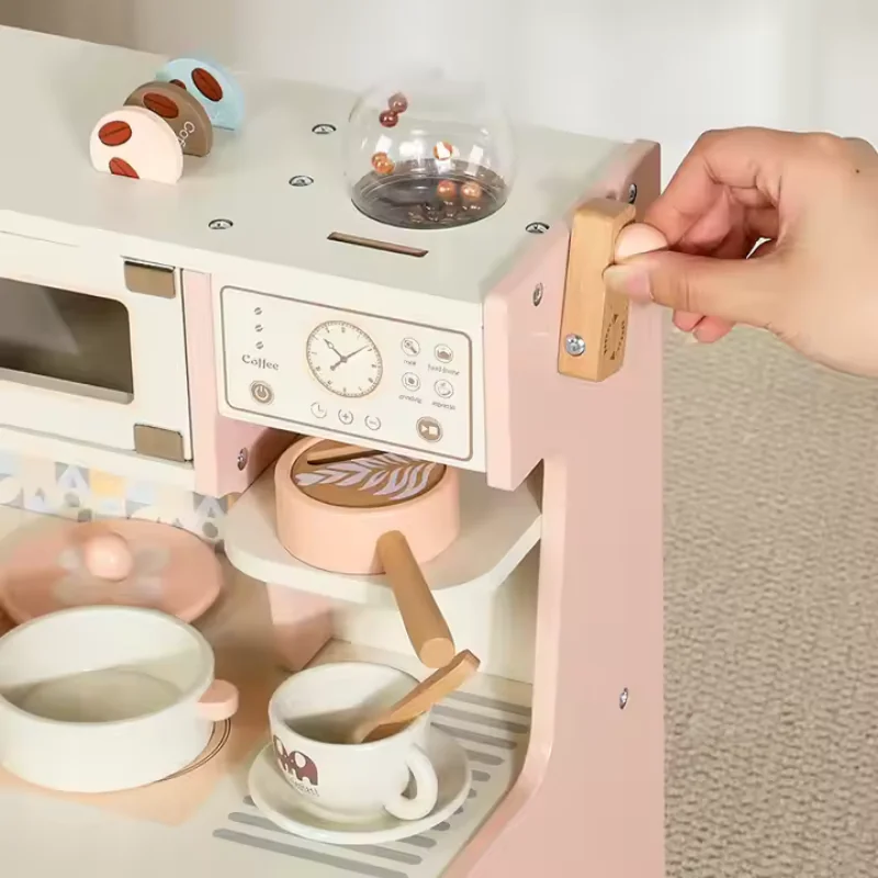 This Interactive Wooden Pink Play Kitchen Set for Toddlers boasts numerous features designed to keep your little ones engaged. The set includes a coffee machine, pots, pans, and various food items, enabling possibilities for creative cooking scenarios. Each piece in the Kitchen Set for Toddlers is designed with safety in mind, ensuring that they are free from sharp edges and toxic materials.