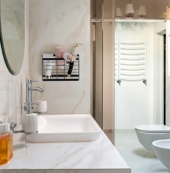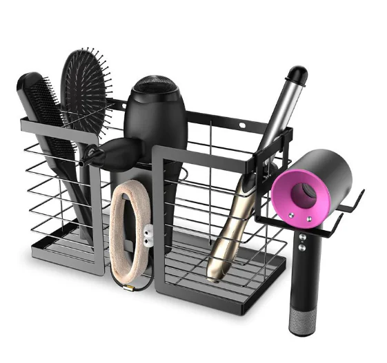 Stores Hot Tools: Hair styling tool have 3 compartments hold hair dryers, flat irons, curling irons and brushes, while the bathroom organizer basket helps to corral cords; The steel wire lets you store tools even while they’re still hot.