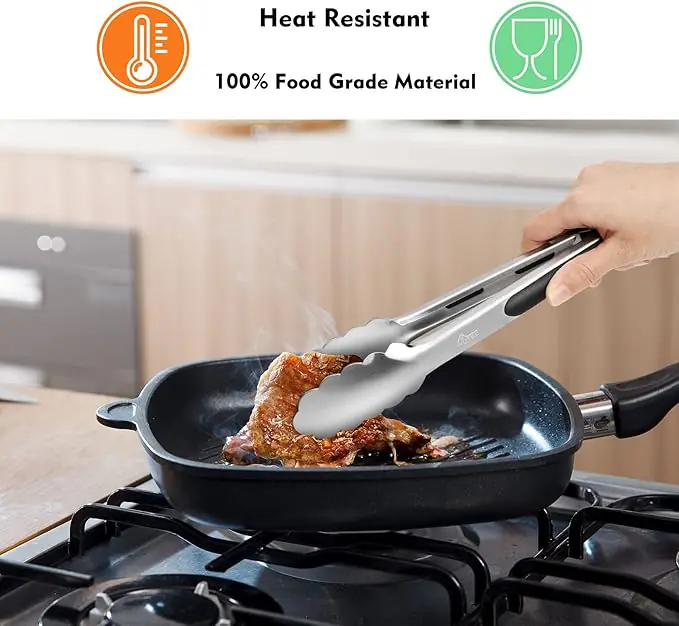 What sets these cooking tongs apart is their engineered build and user-friendly design. The pull-ring locking mechanism makes them easy to store and hang, saving valuable kitchen space. Their cushioned silicone handles provide a non-slip, ergonomic grip that ensures comfort and control even in high-temperature settings. The tongs’ reinforced stainless steel construction resists rust, corrosion, and heat, making them a dependable tool for continuous use. Rounded edges protect hands from injury, and the tong head is crafted for secure food handling, making these BBQ tongs perfect for both delicate and heavy-duty tasks.