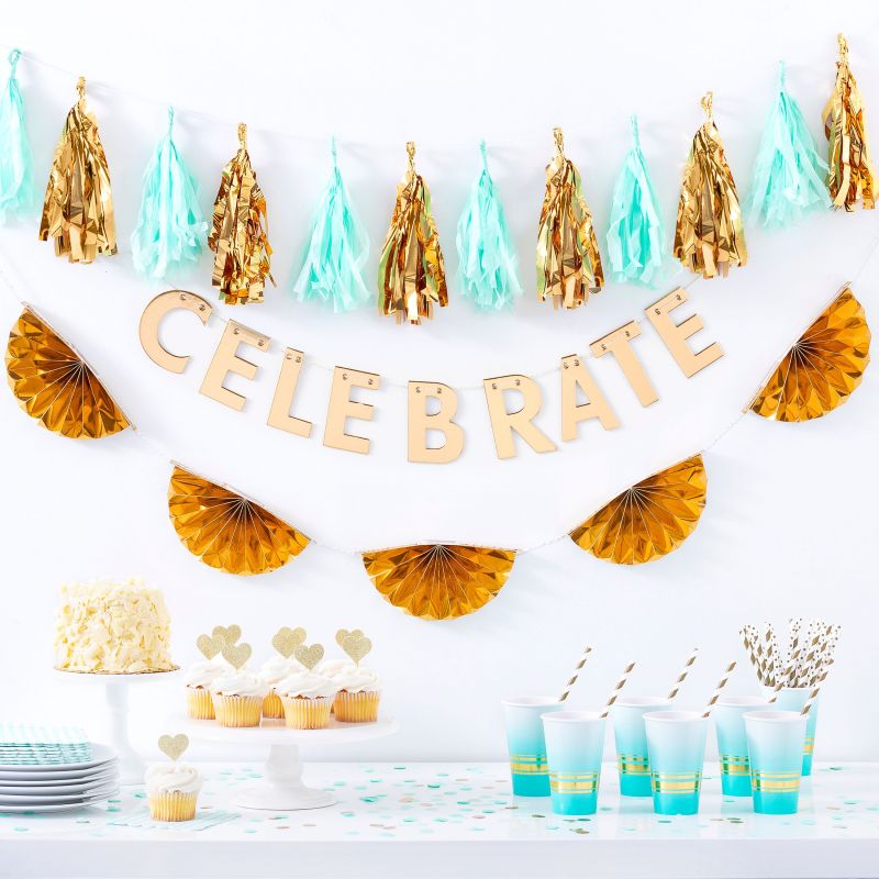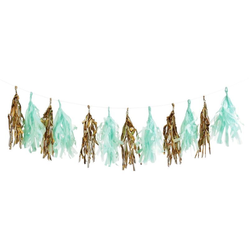 Hang this eye-catching gold and mint Mylar tassel garland at your next special event. Embellish a wall, doorway, mantel or entryway with this garland. Create a trendy one of a kind decoration by mixing and matching it with other tassels. Add the finishing touches to any event with this versatile garland.