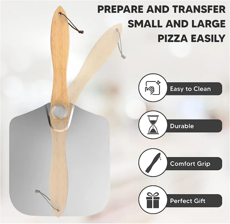 Why Choose Kitchenware Hero Pizza Peel Our pizza peel is made of food-grade aluminum and high-quality wood. It has long-lasting strength, safety and durability. The sturdy pizza shovel is perfect for transferring pizza from your workbench to the oven, and then eating it on the table, without worrying about falling ingredients and the hot oven, making baking easier. The long wooden handle makes handling pizza easy and comfortable, and keeps your fingers away from the hot oven. Aluminum pizza shovel is lighter, easier to clean, safer, and does not absorb harmful odors and food particles. Pizza paddle is very suitable for any kitchen decoration and bakeries. It can be used in household ovens, outdoor wood-burning ovens or professional kitchens. Suitable for experienced chefs as well as novices. How to use pizza peel? 1. Put the screws on the back, and place the handle according to the position of the screws. The bolts and nuts are combined together. Please tighten the metal screws before use. 2. Sprinkle flour, cornmeal or wheat bran evenly on the pizza peel to make the pizza dough easy to slide. 3. Before the dough absorbs the flour, quickly place it on the baking sheet or pizza stone. 4. After baking, use the pizza peel to remove the pizza or bread from the oven. 5. Loosen the screw and rotate the wooden handle 180 Degree for easy storage. 6. Use a rocker milling cutter to slice accurately and enjoy your pizza. Care Instructions: Hand wash pizza peel paddle in warm, soapy water. Scrape off any excess food or crumbs from the peel using a soft sponge. Dry immediately. Do not soak or use abrasive scrubbers on the pizza peel. Not dishwasher safe. Do not slice pizza or baked goods on the peel. It may damage knife or scratch peel. Do not leave the pizza peel in the oven for a long time. This will damage handle. After cleaning the pizza peel, dry the surface of the spatula and the woode