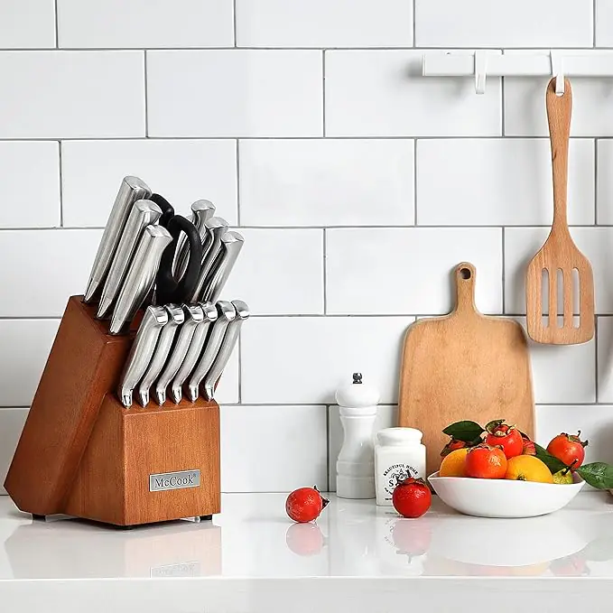 Discover the 15-piece kitchen knife set with built-in sharpener, featuring high-carbon German stainless steel for professional chefs and beginners.