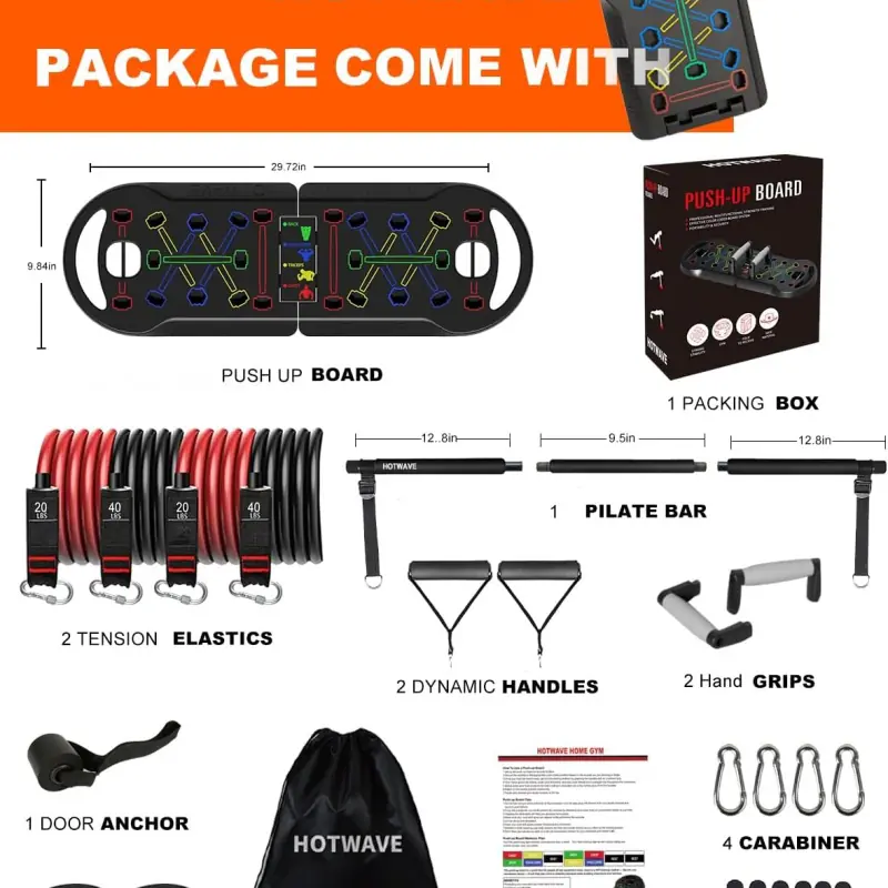 Included Components fitness bar, 1-door anchor, drawstring bag;Exercise guidance, 2-Black foam handle,2-Ankle strap,4-carabiner, 2-20lbs Red latex resistance band;2-40lbs Black latex resistance band