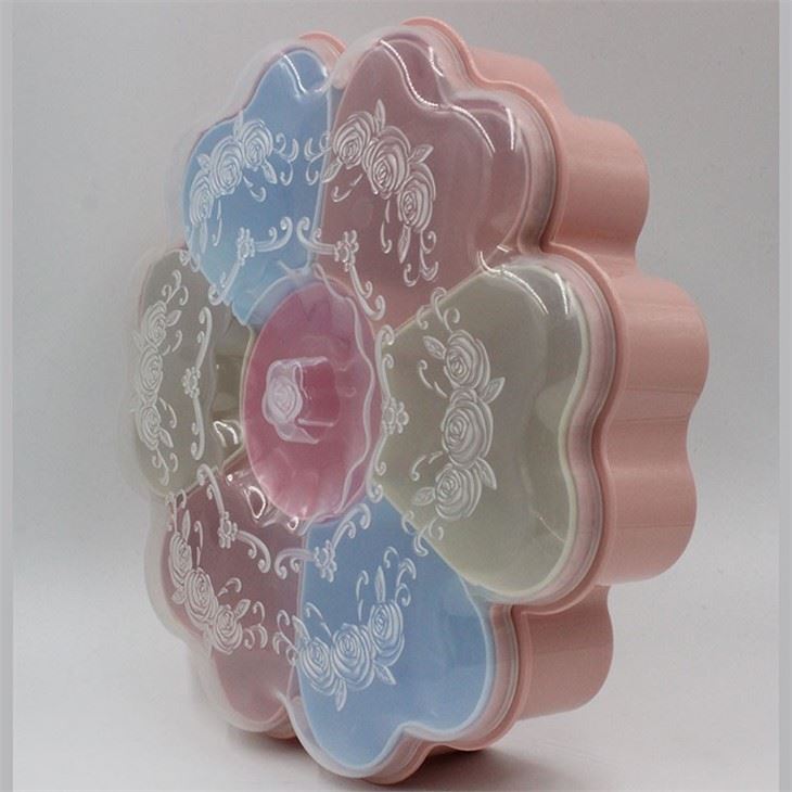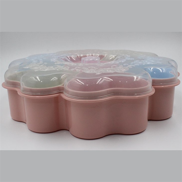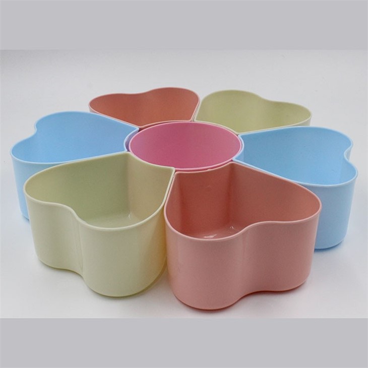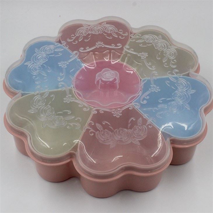 A flower-shaped snack bowl made of high-quality PP. Colorful, with 6 compartments, including the middle circle, suitable for candy, nuts and other food.With a sealing cover, can prevent moisture and prevent odor.