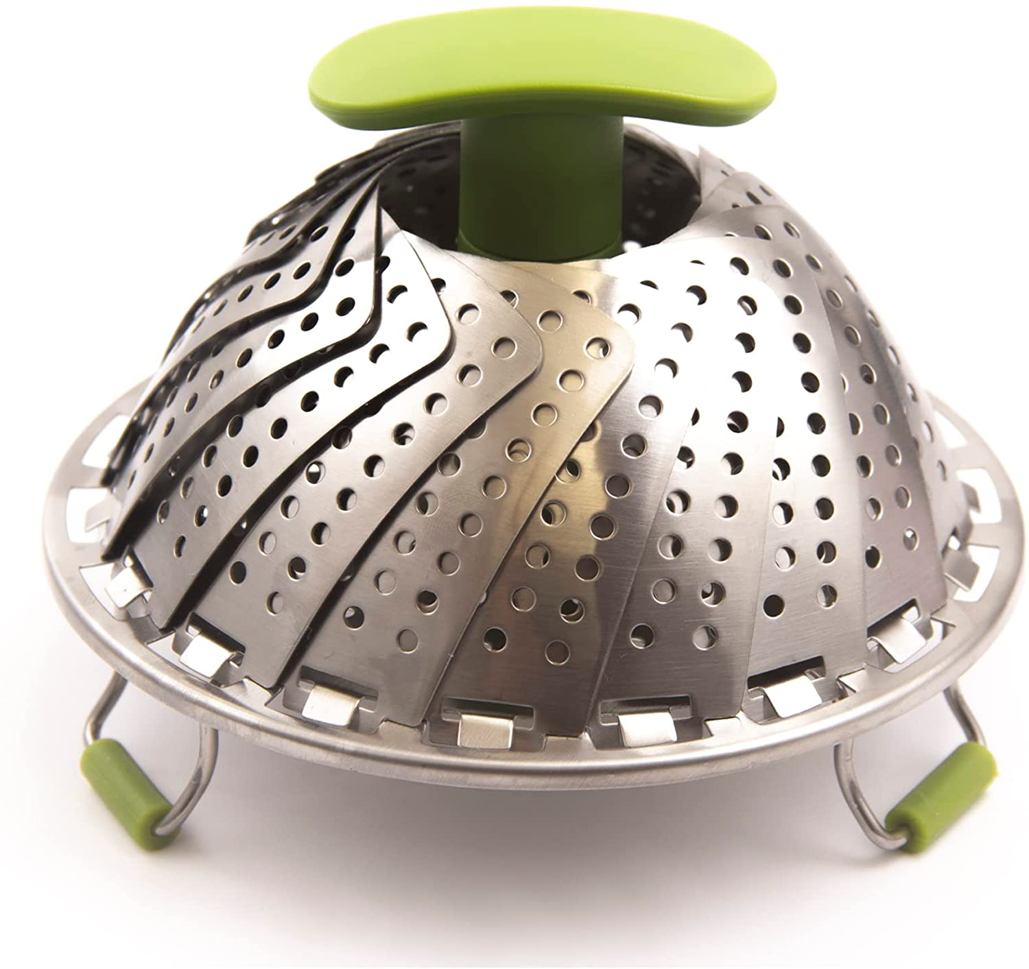 This steamer basket design is taken to levels of practicality and convenience with this high quality, colourful, contemporary version. The unit has self-adjusting sides to fit pans, heat-resistant silicone feet and an enhanced silicone finger guard. It has a large capacity when fully open, but folds neatly away for storage. The unit is non-scratch and suitable for use with both steel pans and non-stick cookware. Heat resistant up to 110 degrees Celsius/230 degrees Fahrenheit. Dishwasher safe.