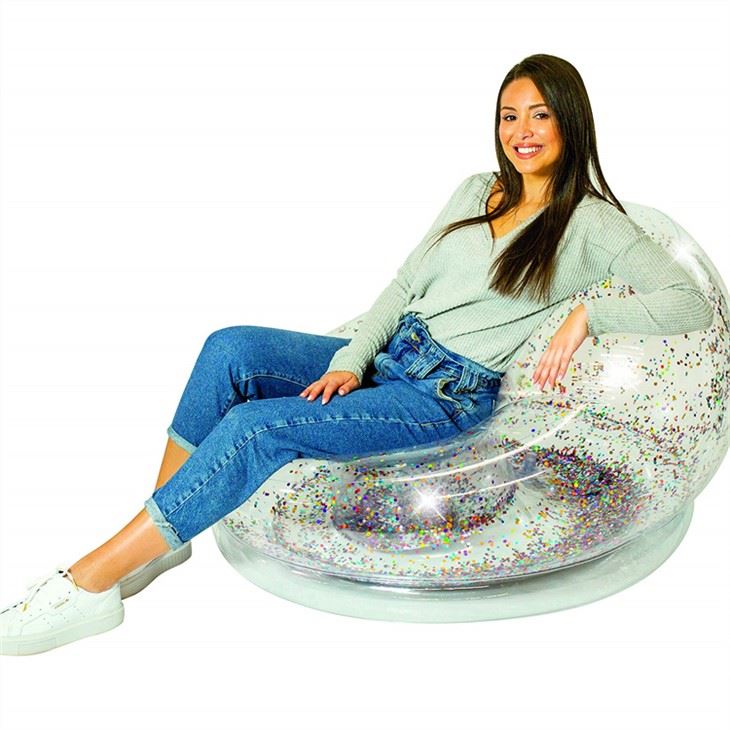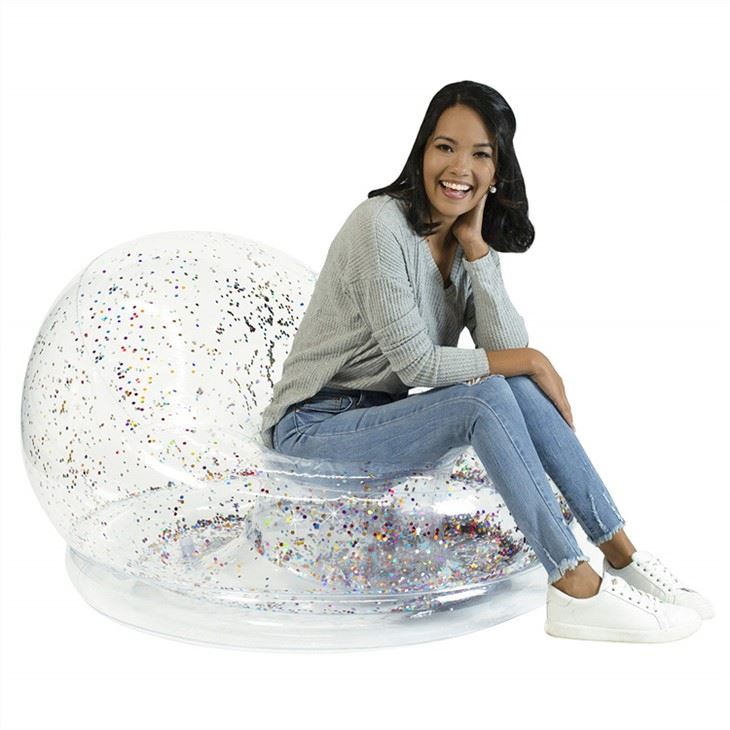 Teardrop-shaped inflatable sofa is filled with colorful paper strips is made of heavy duty PVC, holds 250 lbs and at 40″ x 43″ x 30″ is the perfect size extra chair for any space. The teardrop shape conforms to your body and you can control how firm it is with more or less air. It comes with an instant fix patch in case of accidents.