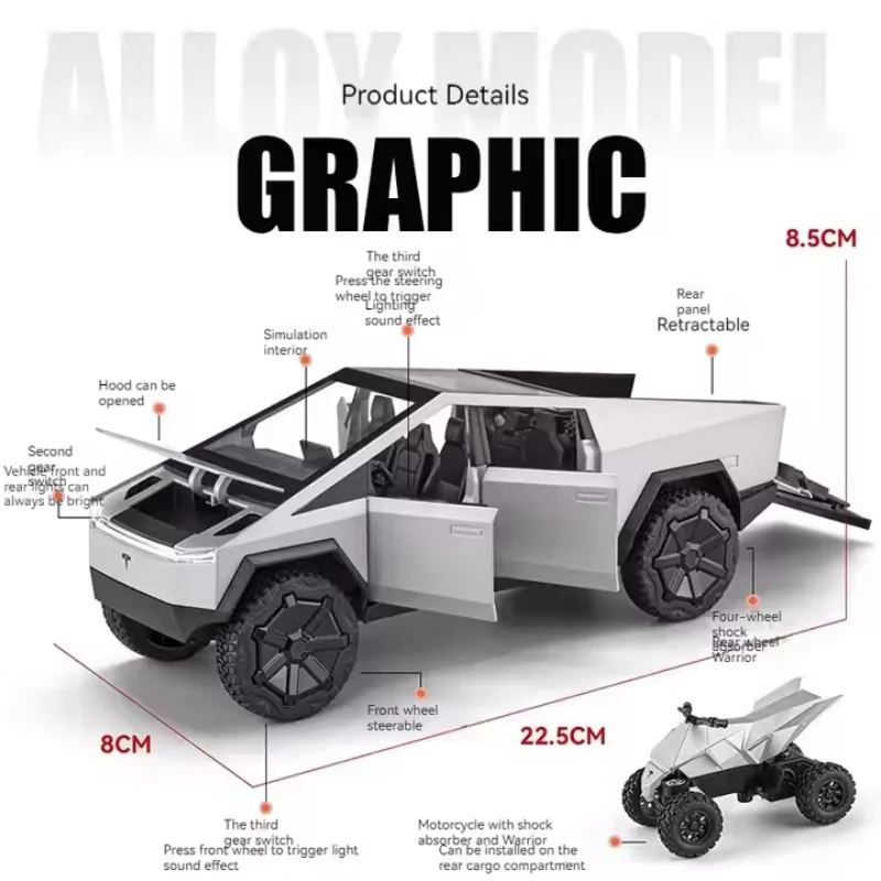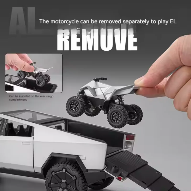 The inclusion of the ATV decorate metal toy alongside the Tesla Cybertruck Pickup elevates the play experience, offering versatility in creating immersive play scenarios. The combination of the ATV and the Cybertruck opens up a world of imagination and adventure, ideal for both solo play and interactive group activities.