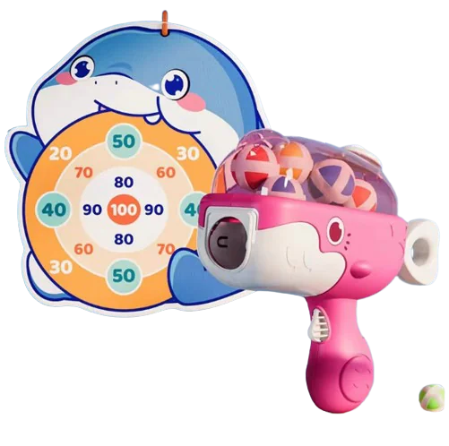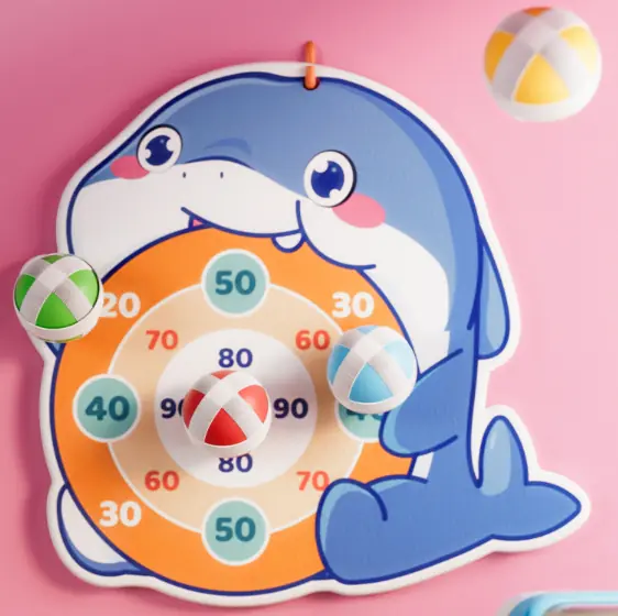 This velcro ball shooting toy is a fun and educational activity set for young children Featuring a soft foam ball launcher shaped like a cartoon whale and a plush dartboard target the toy promotes physical coordination and safe play