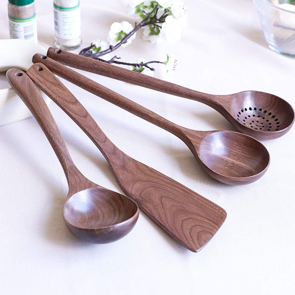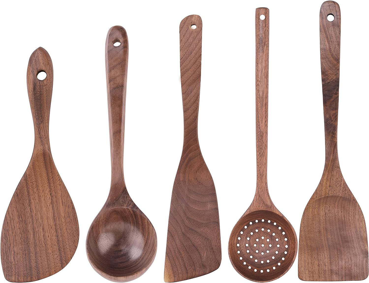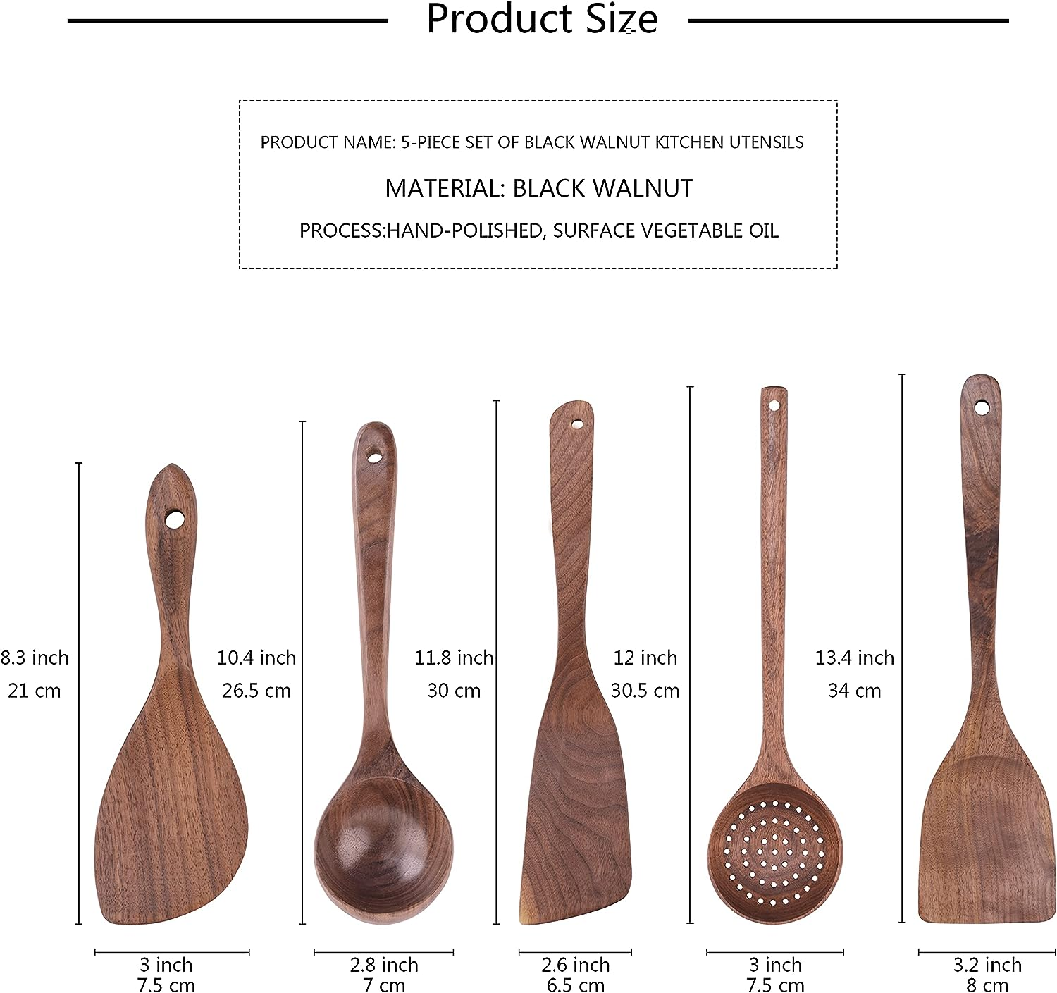 • 5 Pcs Wooden KitchenI Utensil Set: Includes 1 wide angled spatula, 1 long handle angled spatula, 1 wooden wok spatula, 1 soup ladle, 1 rice spoon, 1 Strainer Spoon. Crafted from natural black walnut wood to highlight the natural wood grain. Delicate workmanship, natural finish, comfortable handle, durable & sturdy. without any painting. Each piece is unique because of natural wood construction.