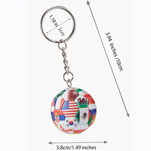 Item Size: The diameter of the soccer ball is 1.49 inches, the diameter of the key ring is 1.2 inches, and the soccer ball key ring total length is 3.9 inches
